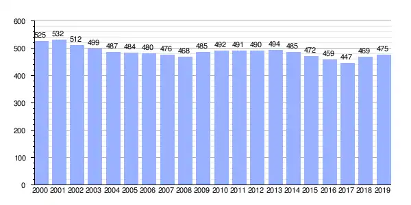 | Gráfica de evolución demográfica de Villanueva[5] entre 2000 y 2019 |