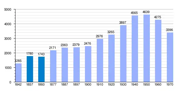 | Gráfica de evolución demográfica de Villargordo[1] entre 1842 y 1970 |