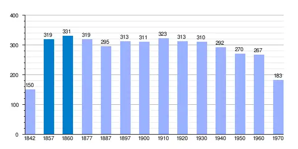 | Gráfica de evolución demográfica de Villavieja de Muñó[7] entre 1842 y 1970 |