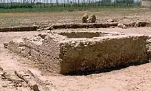 Zona de baños de una hacienda agrícola. Los muros de canto, arena y cal pertenecerían a la piscina o zona fría, y al lado estaría la zona caliente con las termas y habitaciones.