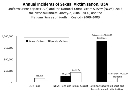 Con respecto a la mala conducta sexual entre mujeres, el Departamento de Justicia de EE. UU. informa en su declaración de apertura (página 5): "Se estima que el 4,4% de los prisioneros y el 3,1% de los detenidos reportaron haber experimentado uno o más incidentes de victimización sexual por parte de otro recluso o personal de la instalación en los últimos 12 meses, o desde la admisión a la instalación, si es menos de 12 meses". Con respecto a la conducta sexual inapropiada de mujer a hombre (página 25), dice: "Entre los 39.121 reclusos varones que habían sido víctimas de conducta sexual inapropiada por parte del personal, el 69% reportó actividad sexual con personal femenino; un 16% adicional informó actividad sexual con ambos personal femenino y masculino (tabla 18)". y "Casi dos tercios de los reclusos varones que habían sido víctimas dijeron que el perpetrador del personal fue una mujer (64%)".[15]