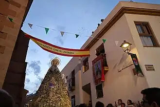 El pueblo ya de por sí engalanado con geranios, se engalana con sus mejores galas en balcones y ventanas para recibir a su amantísima Patrona.