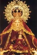 Tallada en 1940, la imagen actual se basa en una reproducción de otra supuestamente originaria del siglo X-XI. Es de 60 centímetros de altura y representa a María, sedente, portando al Niño Jesús en su brazo izquierdo, mostrando una manzana dorada en la mano derecha. El Niño Jesús porta en su mano izquierda una pequeña bola del mundo . La actual imagen es una copia de la original debido a que la original fue destruida en la Guerra Civil Española.
