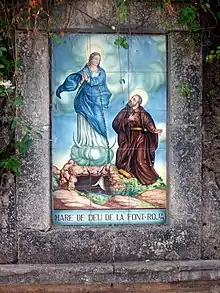 ![]() La Virgen de los Lirios y San Felipe Neri en la Font Roja. Según el historiador Adrián Espí, Felipe Neri ocupa el lugar de Antoni Bonaventura Guerau miembro de su congregación (Congregación del Oratorio).[1] | ||