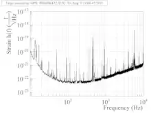 Virgo es un detector de banda ancha cuya sensibilidad abarca desde unos pocos Hz hasta 10 kHz. Matemáticamente hablando, su sensibilidad se caracteriza por su espectro de potencia que se calcula en tiempo real a partir de los datos registrados por el detector. La curva contigua muestra un ejemplo de la densidad espectral de amplitud (raíz cuadrada del espectro de potencia) de Virgo en 2011, dibujada usando escala logarítmica.