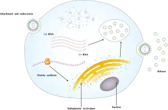 Los virus dependen de su huésped para replicarse y multiplicarse. Esto se debe a que los virus son incapaces de experimentar división celular, pues son acelulares –es decir, carecen de la información genética que codifica los componentes necesarios para la síntesis de proteínas o la generación de energía metabólica. Utilizando el mecanismo celular del huésped, el virus genera copias de su genoma, y produce nuevos virus para la supervivencia de su clase y la infección de nuevos huéspedes. El proceso de replicación viral varía dependiendo del genoma del virus.[2]