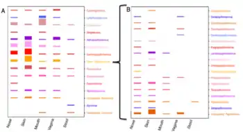 Diversos virus colonizan la piel humana y difieren según el sitio de la piel.[25] Estos viromas de la piel incluyen virus humanos (virus del papiloma humano) y bacteriófagos (virus bacterianos) que infectan bacterias cutáneas comensales como los estafilococos.[26] Las comunidades de virus difieren según los niveles de humedad y el grado de protección del ambiente externo.