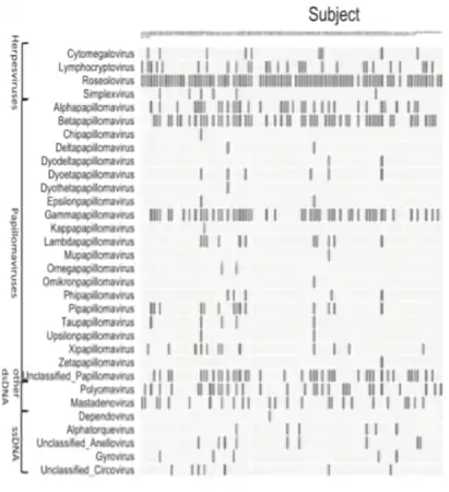 Uno de los primeros estudios que utilizó la secuenciación de ADN de alto rendimiento para describir la diversidad de los virus de ADNds eucariotas en individuos normales incluyó 706 muestras de 102 sujetos.[15] Este estudio detectó un promedio de 5.5 géneros virales en cada individuo y estos virus incluyeron herpesvirus, papilomavirus, poliomavirus, adenovirus, anellovirus, parvovirus y circovirus.