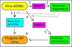 | Replicación del genoma: | ADNbc → ADNbc |