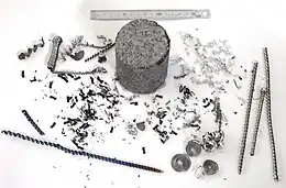 Varios ejemplos de virutas de metal con un taco de virutas comprimidas para facilitar el reciclaje.