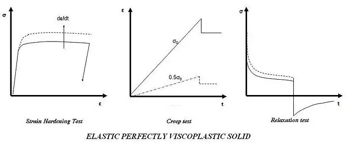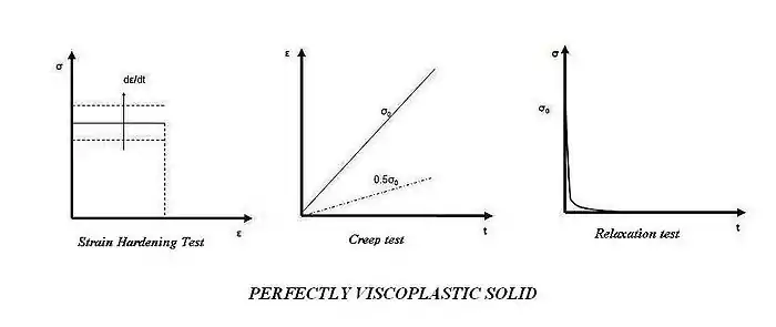 Estos modelos se pueden aplicar a metales y aleaciones a temperaturas superiores a dos tercios[20] de su punto de fusión absoluto (en kelvins) y a polímeros y asfalto a temperatura elevada. Las respuestas para las pruebas de endurecimiento por deformación, fluencia y relajación de dicho material se muestran en la figura adjunta.