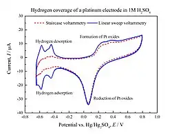 La voltamperometría escalonada es un derivado de la voltamperometría de barrido lineal[1][2]. En la voltamperometría de barrido lineal, se mide la corriente en un electrodo de trabajo mientras se barre linealmente en el tiempo el potencial entre el electrodo de trabajo y el electrodo de referencia. La oxidación o reducción de las especies se registra como un pico o un valle en la señal de corriente al potencial en el que la especie comienza a oxidarse o reducirse.