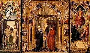 Museo del Prado, Madrid | En el panel central se representa la Crucifixión de Jesús en el interior de un templo gótico, tal como había hecho Rogier van der Weyden en el Retablo de los siete Sacramentos del Museo Real de Bellas Artes de Amberes. Los sacramentos -seis- que Van der Weyden pintó en las tablas laterales aquí aparecen en las jambas, en pequeñas escenas cobijadas bajo doseletes góticos, con otras seis escenas de la Pasión en la arquivolta.[9] En las tablas laterales las escenas representadas son la Expulsión del Paraíso y el Juicio Final, cobijadas también bajo arcos de tracería gótica. El tríptico fue donado por Leonor Mascarenhas, aya de Felipe II, al convento fundado por ella de Nuestra Señora de los Ángeles de Madrid, del que pasó al Museo de la Trinidad tras la desamortización de Mendizábal. Descartada la autoría de Vrancke van der Stockt, el tríptico completo ha pasado a asignarse a un Maestro de la Redención del Prado.[9] |