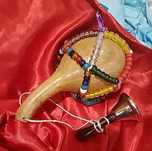 Un batèms (bautismo) es un ritual utilizado para convertir un objeto en un recipiente para el loa.[174] Se cree que los objetos consagrados para uso ritual contienen una esencia o poder espiritual llamado nanm.[175] El ason (escrito también asson) es un sonajero sagrado que se utiliza para invocar a los loa. Consiste en una calabaza vacía, seca, cubierta de cuentas y vértebras de serpiente. Antes de ser utilizado en el ritual requiere ser consagrado.[176] Es un símbolo del sacerdocio;[176] asumir los deberes de un manbo u oungan es llamado «tomar el ason». Otro tipo de objeto sagrado son las «piedras de trueno», a menudo cabezas de hacha prehistóricas, que son asociadas con loa específicos y que se conservan en aceite para preservar su poder.[177]