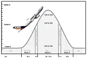 Al llegar a los 6000 metros de altitud, aproximadamente, el avión sostiene (o la inicia, si es el caso) una ascensión en ángulo de 47°, lo que provoca una sensación de sobregravedad en su interior de entre 1,8 y 2 g. Al alcanzar a unos 8000 m se cambia la trayectoria, empieza un descenso de inclinación progresiva durante el que la potencia de los motores baja hasta un mínimo que se usa para contrarrestar la resistencia del aire. La sensación de gravedad baja a valores próximos a cero. Tras unos segundos de bajada el avión va elevando progresivamente el morro, con lo que la sensación de gravedad aumenta paulatinamente, los motores van incrementando potencia para nivelar el aparato sobre los 6000 m y se vuelve a ascender, volviendo a sufrir un efecto de sobregravedad, y así alternativamente.