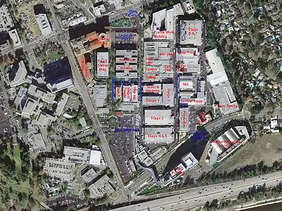 En 1986, después de la reestructuración corporativa de Walt Disney Productions en The Walt Disney Company, los estudios fueron remodelados para acomodar más espacio de producción en vivo y oficinas administrativas. El estudio ahora alberga múltiples oficinas y edificios administrativos y siete sound stages. Está delimitada por South Buena Vista Street en el oeste, West Alameda Street en el norte, South Keystone Street en el este y West Riverside Drive en el sur. Se encuentra en un área de Burbank donde la cuadrícula de la calle está desviada en diagonal, pero la mayoría de los edificios y carreteras originales dentro del campus en sí se alinearon con los puntos cardinales.