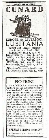 - El 30 de abril se había publicado en los diarios americanos del riesgo de navegar por aguas consideradas territorios de guerra, en donde el gobierno alemán que no estaba en lo absoluto interesado en que hubiesen bajas neutrales había declarado abiertamente las zonas de exclusión. Solo un tabloide publicó dicho aviso.