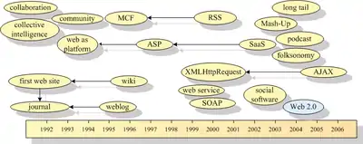 En 2005, Tim O'Reilly definió el concepto de Web 2.0. Un mapa mental elaborado por Markus Angermeier resume la relación del término Web 2.0 con otros conceptos. En la conferencia, O'Reilly, Battelle y Edouard resumieron los principios claves que creen que caracterizan a las aplicaciones web 2.0: la comunidad como plataforma; efectos de red conducidos por una "arquitectura de participación" innovación y desarrolladores independientes; pequeños modelos de negocio capaces de difundir servicios y contenidos; el perpetuo beta; software por encima de un solo aparato.