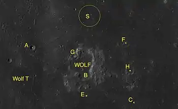 Por convención estos elementos son identificados en los mapas lunares poniendo la letra en el lado del punto medio del cráter que está más cerca de Wolf.