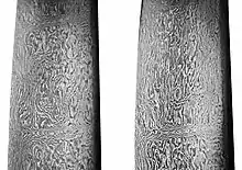 Los aceros de crisol como el acero wootz y el acero de Damasco muestran patrones de bandas únicos debido a las aleaciones de ferrita y cementita entremezcladas en el acero.