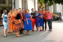 Yekaterina (en el vestido azul) durante el rodaje de la película "Mod".