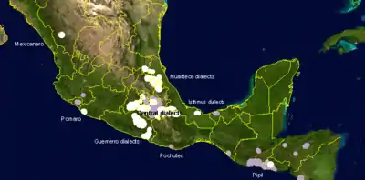 Mapa de dialectos del náhuatl en México, con base en el artículo de Yolanda Lastra "Áreas dialectales del náhuatl moderno".
