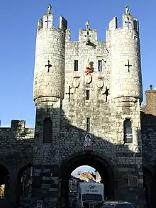 Así, fue creciendo y se hizo cinco veces más grande que la ciudad fortificada romana original. Por ello, se construyó una nueva muralla entre 1250 y 1300 que circundaba unos 263 acres en los que la población en crecimiento se apretaba. El territorio de la ciudad contaba en total con 40 iglesias, 9 capillas, 4 monasterios, 4 conventos, 16 hospitales y 9 casas de guildas u oficios para el comercio y la confraternidad. La muralla conserva sus cuatro puertas: Micklegate ("Calle Grande" en nórdico antiguo) que cubre el camino hacia el sur, Bootham hacia el norte, Monk hacia Scarborough y Walmgate hacia Hull. Todas ellas tienen las características típicas de una puerta medieval (barbacana, rastrillo, puente levadizo, sala de guardia y torre de vigilancia).