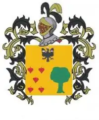 Partido: 1°, de oro, un árbol verde; 2°, de rojo, nueve panelas de plata.