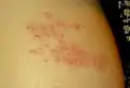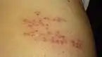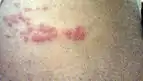 La fase posterior comienza a las 12-24 horas y constituye el desarrollo del característico sarpullido cutáneo. Las lesiones comienzan como manchas eritematosas que pasan a vesículas distribuidas en dermatomas, comúnmente en un patrón que simula un cinturón y sin pasar la línea media del cuerpo. No suelen afectarse más de tres metámeras. Las regiones más comunes son la región media del tórax —desde T3 a L2— y la zona oftálmica de la cara, donde puede tener consecuencias sobre la visión.[4][28] Rara vez ocurren en la mitad distal de las extremidades. Normalmente, aparecen nuevas lesiones durante la primera semana. Al tercer día, las vesículas se van transformando en ampollas llenas de un fluido seroso, generalmente dolorosas y acompañadas de ansiedad y un cuadro pseudogripal con fiebre, cansancio y dolor generalizado. Estas se secan, permaneciendo como costras durante 2 o 3 semanas.[7] Ocasionalmente, el contenido de las vesículas puede ser hemorrágico, y estallar en un plazo de 7 a 10 días. Cuando esto ocurre, resuelven con cicatriz e hiperpigmentación.[28]