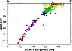 Los terremotos de la zona de Wadati-Benioff se desarrollan debajo de los arcos de islas volcánicas y de los taludes continentales sobre las zonas de subducción activas.[3] Pueden producirse por deslizamiento a lo largo de la falla de cabalgamiento de subducción o por deslizamiento en fallas dentro de la placa descendente, y como resultado de la flexión y extensión de la placa, esta es arrastrada hacia el manto.[4] Los sismos de foco profundo a lo largo de la zona permiten a los sismólogos mapear la superficie tridimensional de una placa subducida de corteza oceánica y del manto.