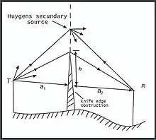 El efecto de filo de cuchillo o difracción de bordes se puede determinar con el principio de Huygens-Fresnel. En la propagación electromagnética se trata de un re-direccionamiento causado por la difracción de las ondas de radio al golpear sobre colinas, edificaciones u otro obstáculo cuyo ángulo es agudo. Aunque el cálculo de estas pérdidas en terrenos irregulares es un problema matemático complejo, se han realizado diferentes expresiones para las pérdidas de difracción en casos simples. Cuando la difracción es causada por un solo objeto, como una colina o edificación, la atenuación (perdida de potencia) causada por la difracción se puede estimar tratando la obstrucción como un filo de difracción. Este es el más simple de los modelos, y la pérdida de difracción en este caso se pueden estimar fácilmente utilizando la solución de Fresnel clásica para el campo detrás del filo de un cuchillo. La figura 3. ilustra este enfoque.[2]