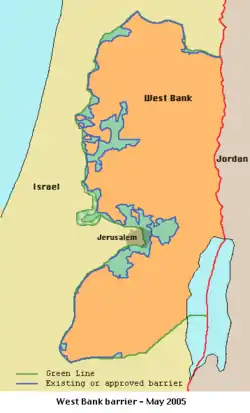 A fecha de 2019, el muro de separación todavía no se ha construido en su totalidad. Según el mapa oficial publicado por el gobierno israelí, las siguientes ciudades y pueblos palestinos quedarán al oeste del muro y, por lo tanto, separados del resto de Palestina: