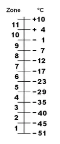 | 6 | a | −23.3 °C (−10 °F) | −20.6 °C (−5 °F) |