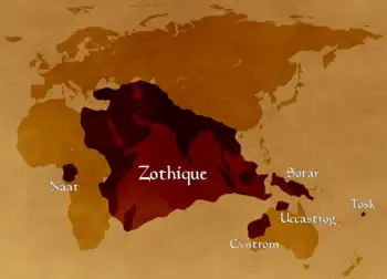 Zothique está sugerida de manera vaga por las teorías teosóficas acerca del pasado y el futuro de los continentes. Es el último continente habitado de la Tierra. Los continentes de nuestro ciclo presente se han hundido, hace tal vez evos. Algunos permanecen sumergidos, otros, han re-emergido, parcialmente y se han re-situado por sí mismos. Zothique, como yo lo concibo, incluye Asia Menor, Arabia, Persia, la India, partes del norte y este de África, así como gran parte del archipiélago de Indonesia. Una nueva Australia existe en alguna parte al sur. Hacia el oeste, solo se conocen unas pocas islas, como Naat, en la que sobreviven caníbales negros. Hacia el norte, hay inmensos desiertos inexplorados, hacia el este un inmenso mar virgen. La gente es en su mayoría de ascendencia aria o semítica, pero hay un reino negro (Ilcar) en el noroeste; y negros desperdigados por el resto de países, sobre todo en los harenes palaciegos. En las islas del sur, sobreviven vestigios de las etnias de Indonesia o Malasia. La ciencia y la maquinaria de nuestra civilización ha sido olvidada tiempo atrás, junto a nuestra presente religión. Pero hay muchos dioses que son adorados; y la hechicería y la demonología prevalecen de nuevo como en los días de la antigüedad. Los marineros solo emplean remos y velas. No hay armas de fuego –solo arcos, flechas, espadas, lanzas, etc. como en la antigüedad. El idioma hablado principalmente hablado (del cual tengo probados ejemplos en un drama no publicado) tiene bases en la raíz indoeuropea y desciende ampliamente del sánscrito, el griego y el latín.