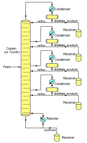 La imagen 3 muestra una torre de destilación fraccionada continua simple para separar una corriente de alimentación en dos fracciones, un producto de destilado de cabeza y un producto de fondo. Los productos "más ligeros" (aquellos con el punto de ebullición más bajo o la mayor volatilidad) salen de la parte superior de las columnas y los productos "más pesados" (los fondos, los que tienen el punto de ebullición más alto) salen de la parte inferior de la columna. La corriente de cabeza puede ser enfriada y condensada utilizando un refrigerado por agua o refrigerado por aire del condensador. El hervidor de fondos puede ser un intercambiador de calor calentado por vapor o por aceite caliente, o incluso un horno de gas o de aceite.