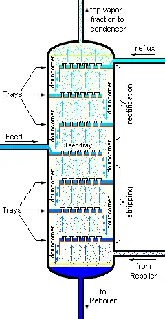 Aunque las unidades de tamaño pequeño, en su mayoría de vidrio, se pueden usar en laboratorios, las unidades industriales son recipientes de acero grandes y verticales (ver imágenes 1 y 2) conocidas como "torres de destilación" o "columnas de destilación". Para mejorar la separación, la torre normalmente está provista en el interior con placas horizontales o platos como se muestra en la imagen 5, o la columna está empacada con un material de empaque. Para proporcionar el calor requerido para la vaporización involucrada en la destilación y también para compensar la pérdida de calor, el calor se agrega más a menudo a la parte inferior de la columna mediante un hervidor, y la pureza del producto superior se puede mejorar reciclando parte del externo Producto líquido condensado superior como reflujo. Dependiendo de su propósito, las columnas de destilación pueden tener salidas de líquido a intervalos a lo largo de la columna como se muestra en la imagen 4.
