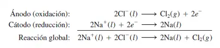 En su fase fundida, el cloruro de sodio (un compuesto iónico) se puede electrolizar para formar sodio metálico y cloro. En el NaCl fundido, los cationes y los aniones son los iones Na+ y Cl-, respectivamente. La figura que se muestra debajo, es un diagrama simplificado que muestra las reacciones que tienen lugar en los electrodos. La celda electrolítica contiene un par de electrodos conectados a una batería. Ésta funciona como una «bomba de electrones» que los lleva hacia el cátodo, donde se efectúa la reducción y los retira del ánodo, donde se realiza la oxidación. Las reacciones en los electrodos son: