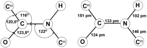 - Los cuatro átomos del enlace (CO-NH) se hallan en un mismo plano, con el Oxígeno y el Hidrógeno en posición trans.