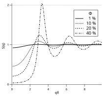 A diferencia de los cristales, la materia en estado líquido no posee orden de alcance largo, por lo que el factor de estructura no exhibe los picos discretos que caracterizan a la difracción por cristales. Sin embargo, los líquidos tienen un cierto grado de orden de corto alcance, que depende de su densidad y la magnitud de la interacción entre sus partículas conformantes. Como los líquidos son isotrópicos, el factor de estructura solo depende del módulo del vector y no de su dirección.[4] Si en la expresión general para el factor de estructura se separan los términos diagonales , cuya fase es 0 y son por tanto iguales a la unidad se obtiene: