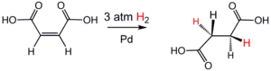 Ejemplo de una reacción de hidrogenación: adición de hidrógeno al ácido maleico para convertirse en ácido succínico, la reacción se lleva a cabo a presión (3 atm) catalizada por paladio.[1]