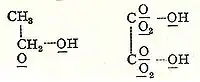 En 1856, el químico escocés Archibald Couper comenzó a investigar acerca de la bromuración del benceno en el laboratorio de Charles Wurtz en París.[12] Un mes después de la aparición del segundo artículo de Kekulé, la teoría de estructura molecular independiente y muy parecida a la de Couper fue publicada. Él ofreció una idea muy concreta de la estructura molecular, proponiendo que los átomos se unían entre sí como Tinkertoys en estructuras específicas tridimensionales. Couper fue el primero en usar líneas entre los átomos, en conjunción con el método ya usado de usar corchetes, para representar enlaces; también postuló cadenas rectas de átomos como la estructura de algunas moléculas, y estructuras de anillo para otras como el ácido tartárico y el ácido cianúrico.[13] En publicaciones posteriores, los enlaces de Couper se representaron usando líneas rectas punteadas (aunque no se sabe si esto fue la preferencia del typesetter como con el alcohol y el ácido oxálico mostrados a continuación: