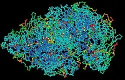 Una macromolécula es una molécula de gran tamaño creada comúnmente a través de la polimerización de subunidades más pequeñas (monómeros). Por lo general se componen de miles, o más átomos. Pueden ser tanto orgánicas como inorgánicas y las más comunes en bioquímica son biopolímeros (ácidos nucleicos, proteínas, carbohidratos y polifenoles) y grandes moléculas no poliméricas (como lípidos y macrociclos).[1] Ejemplo de macromoléculas sintéticas son los plásticos comunes y las fibras sintéticas, así como algunos materiales experimentales, como los nanotubos de carbono.[2][3]