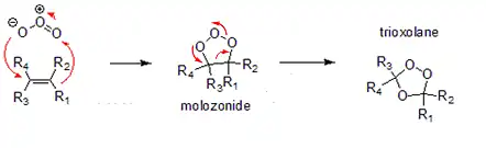 Generación de un ozonuro orgánico. La segunda flecha representa varios pasos según se muestra en ozonólisis.