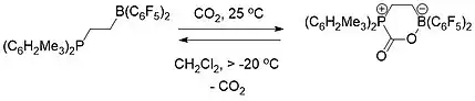 El intramolecular compuesto FLP-CO2 por el contrario era estable como un sólido a temperatura ambiente pero totalmente descompuesto a temperaturas por encima de -20 °C como una solución en diclorometano liberación de CO2 y la regeneración de la molécula de FLP.[16]