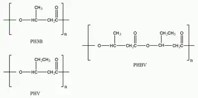 La forma más sencilla y común de producción de PHA es la fermentativa de Polihidroxibutirato (poli-3-hidroxibutirato, P3HB), que está formada por la repetición de entre 1000 y 30000 monómeros de ácidos grasos hidroxilados.