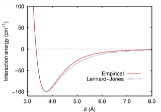i.e., en , el potencial LJ es aproximadamente 1/60 de su valor mínimo (profundidad del potencial).