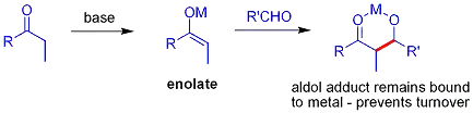 En una adición aldólica usual, un compuesto carbonílico se deprotona para formar un enolato. El enolato se agrega a un aldehído o cetona, lo que forma un alcóxido, que es protonado en un paso adicional. Un método superior, en principio, debería evitar la secuencia de deprotonación-aldol-protonación en favor de una "adición aldólica directa". La característica principal en tal proceso es que la adición aldólica genera un alcóxido, que es mucho más básico que los materiales iniciales, ocasionando la pérdida del catalizador: