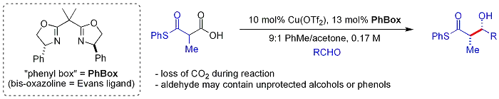 Este método es más efectivo en cuanto a su coste e industrialmente útil que los procedimientos típicos basados en enolato. Una aproximación biomimética posterior elaborada por Shair usa β-tiocetoácidos como el nucleófilo.[52] El intermediario cetoácido es decarboxilado in situ (el ligante quiral como una bisoxazolina). Los aldehídos ramificados o aromáticos son sustratos pobres.
