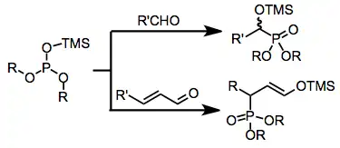 Las fuentes de fósforo ricas en electrones, tales como fosfitos, fosfonitos y fosfinitos, pueden experimentar una adición nucleofílica a los átomos de carbono de los compuestos de carbonilo simples. Cuando se usan fosfitos totalmente esterificados (reacción de Abramov), la neutralización del intermedio tetraédrico resultante generalmente ocurre mediante la transferencia de un grupo alquilo o sililo desde un oxígeno unido al fósforo al centro de alcóxido recién creado. La adición del conjugado también es posible,[3] y proporciona compuestos de carbonilo o éteres de enol γ-funcionalizados después de la transferencia del grupo. El uso de fuentes de fósforo que contienen siloxi ha ampliado enormemente el alcance de esta reacción, ya que los compuestos de α-siloxi resultantes pueden convertirse en los derivados de α-hidroxi correspondientes en presencia de un disolvente alcohólico.[4]