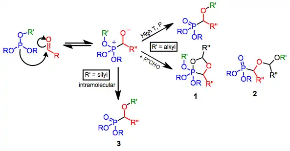 Los fosfitos se adicionan reversiblemente al carbono carbonílico de los compuestos carbonílicos simples. En condiciones suaves, la reversión a los materiales de partida es más rápida que la transferencia de grupos alquilo intramolecular e intramolecular: el estado de transición de cuatro centros para la transferencia intramolecular exhibe una superposición orbital deficiente.[5] La transferencia se puede facilitar en condiciones de alta temperatura o presión. Si se usan dos equivalentes de aldehído, la adición del intermedio tetraédrico a una segunda molécula de aldehído conduce a productos fosforanos cíclicos 1 o de transferencia de alquilo lineales 2.